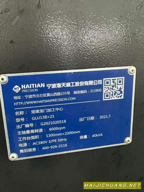 海天2米龙门加工中心,海天精工GLU13IIx21数控龙门加工中心发那科MF pius两线一硬 BT50齿轮头主轴门宽:1400,门高:900工作台三轴行程:X2000/Y1600Z700主轴转速:6000 ,刀库:24 把准新机,安装少用